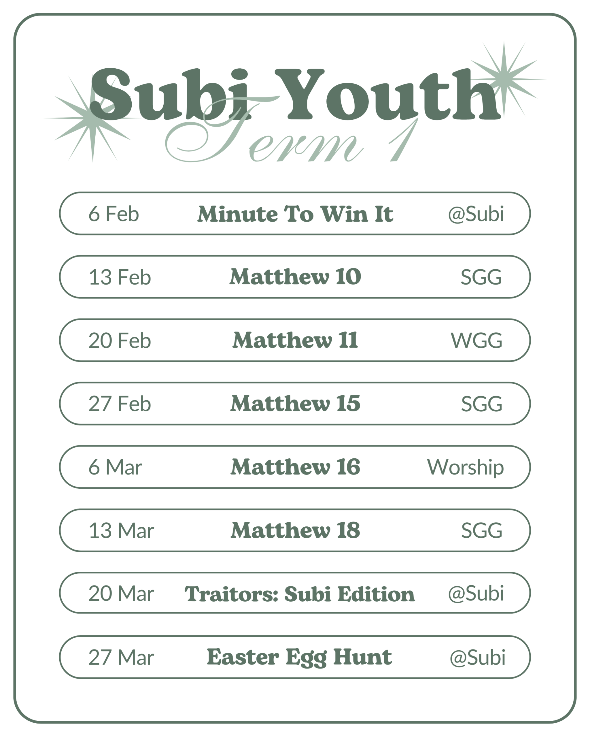 Every Friday night during the school term at church 7pm-9.15pm, you’re invited to join us as we learn about who God is, and deepen our relationship with him and with each other.  These nights come in different shapes and sizes, so we may also plan something offsite (with your parents’ permission of course!). Have a look at the term flyer below to see what is happening this term at Subi Youth.