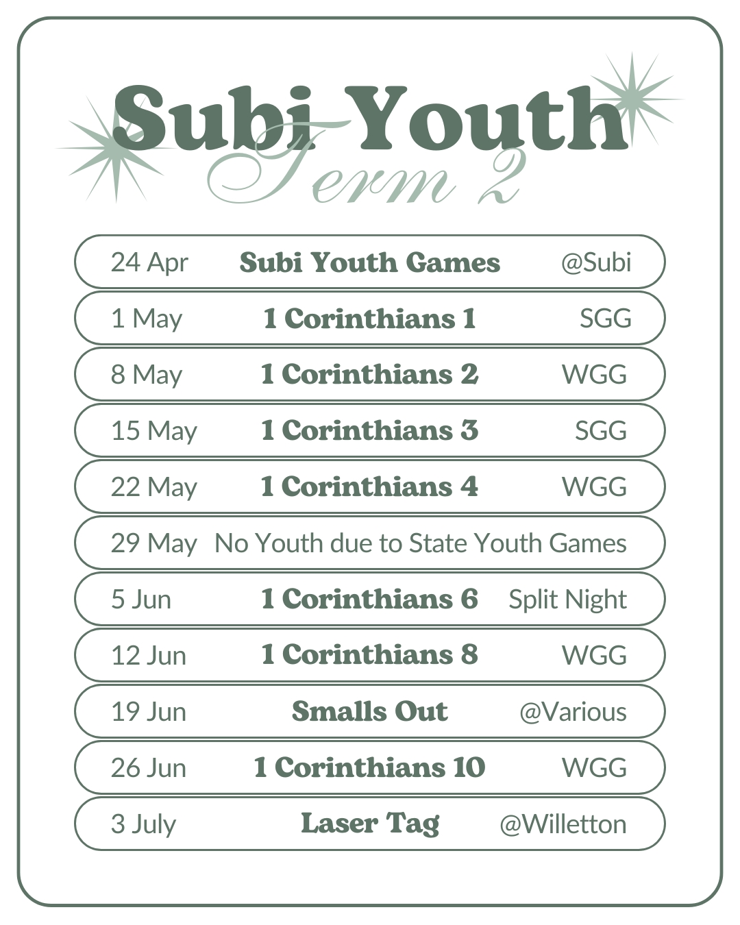 Every Friday night during the school term at church 7pm-9.15pm, you’re invited to join us as we learn about who God is, and deepen our relationship with him and with each other. These nights come in different shapes and sizes, so we may also plan something offsite (with your parents’ permission of course!). Have a look at the term flyer below to see what is happening this term at Subi Youth.